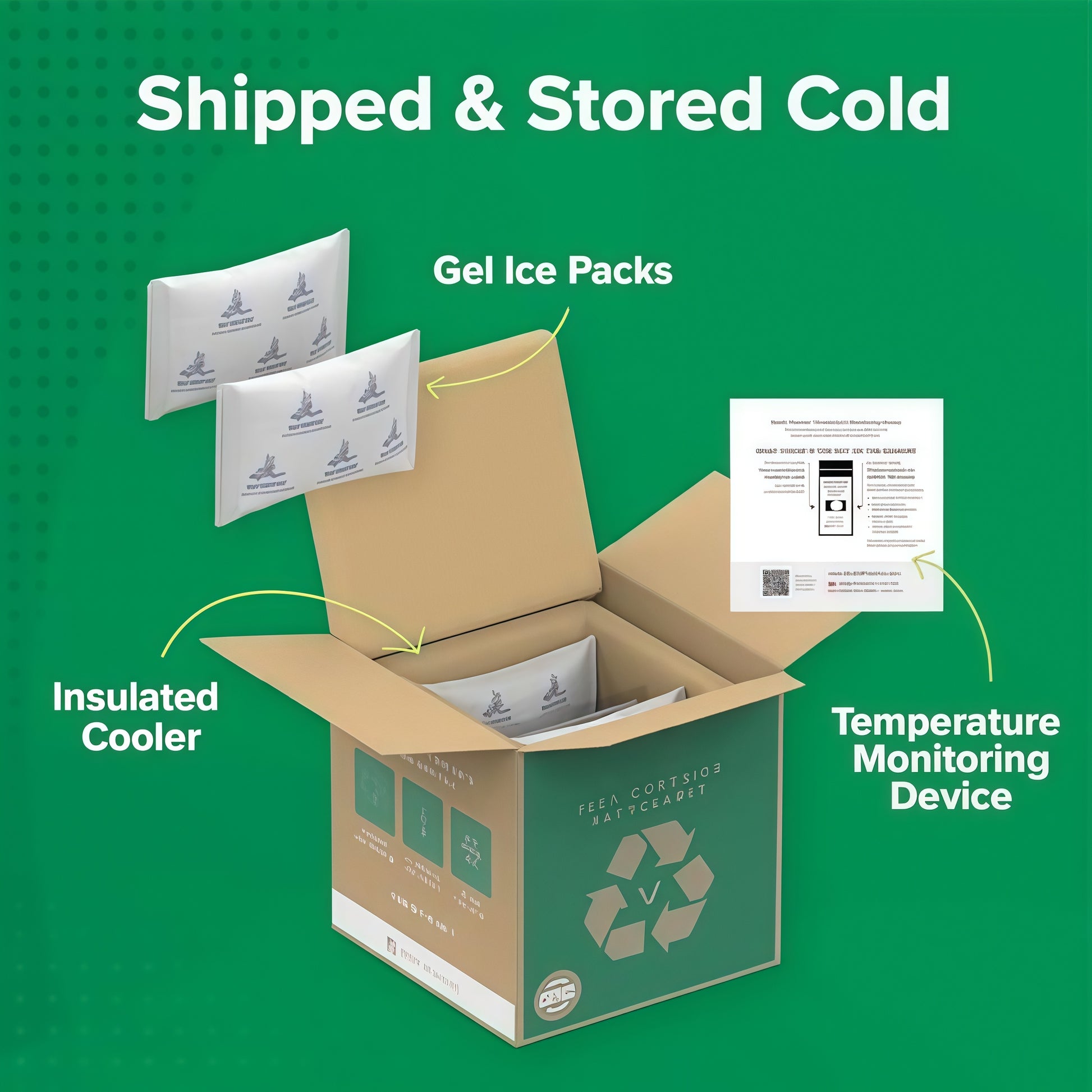 Visbiome is shipped in an insulated container with ice packs and should be stored under refrigerated conditions (36-46°F, 2-8°C) to ensure vitality, as exposure to heat could inactivate some of the live bacterial strains. Every order is accompanied by a temperature monitoring sensor specifically calibrated for Visbiome.